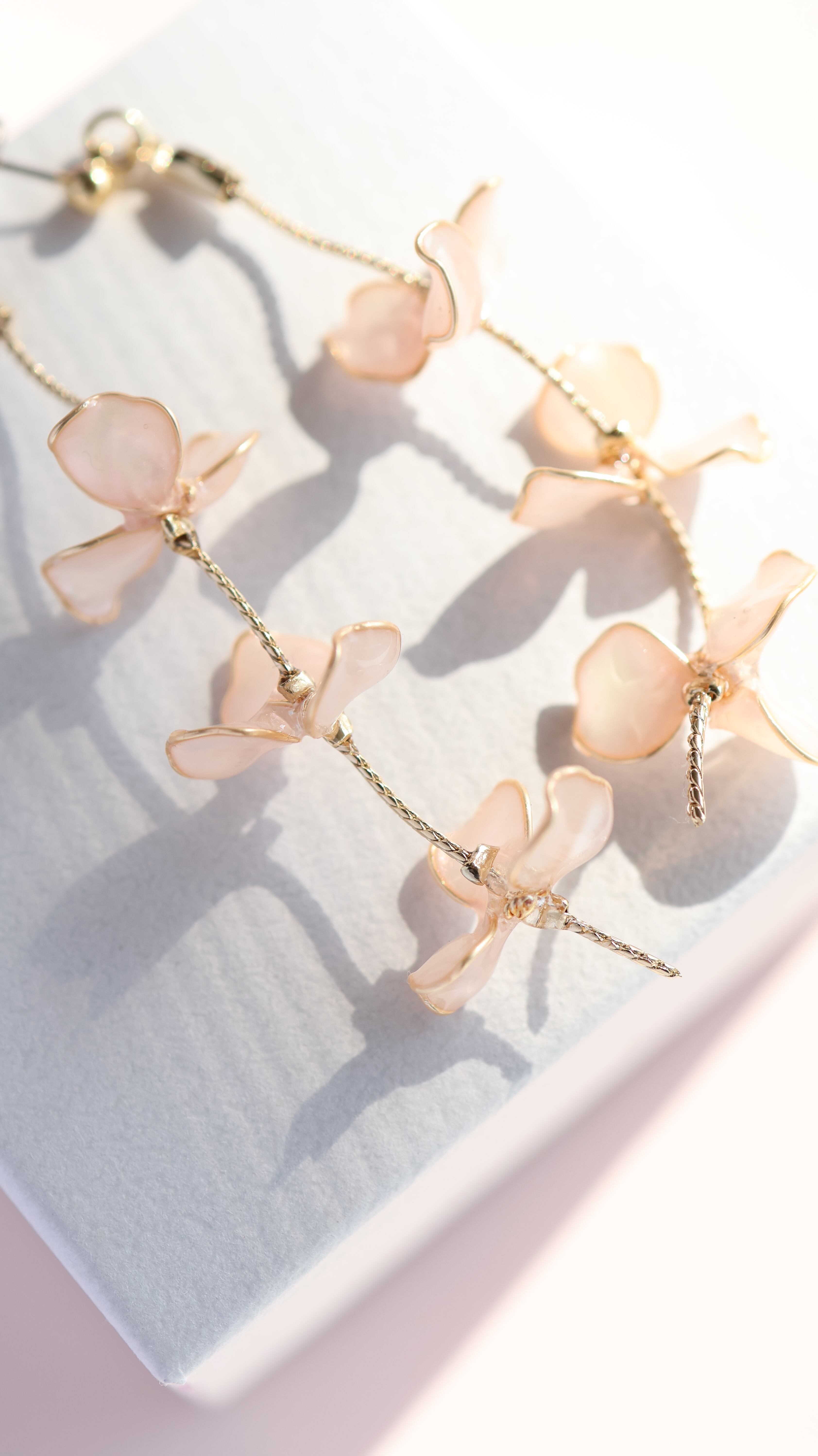 透明感のある花びらと、繊細なゴールドのラインが動くたびにふんわりと光を集め、